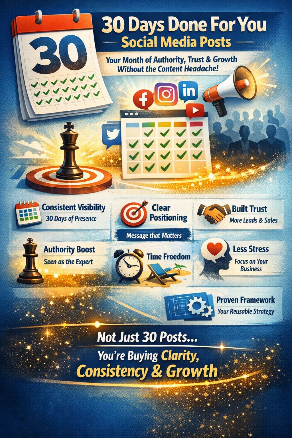Build Authority and Trust fast without creating content yourself. We deliver your 30-Day Done-for-You Social Media Posts Plus in just 14 days.!